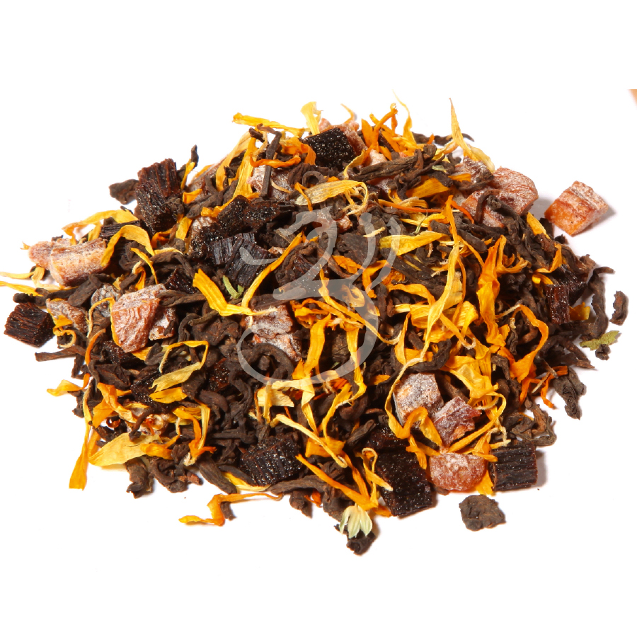 Složení: Puerh, kousky broskví (5%) (broskev, vanilková moučka, aroma), přírodní aroma, květy měsíčku lékařského, kousky bourbon vanilky (1%).