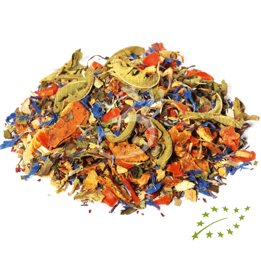Složení: kousky mrkve*, pomerančová kůra *, kousky zázvoru *, ostružinové listy *, rooibos *, kousky jablek *, máta peprná *, verbena listy *, mučenka listy *, lístky chrpy *, přírodní příchuť. Produkty označené * pocházejí z kontrolovaného ekologického zemědělství.