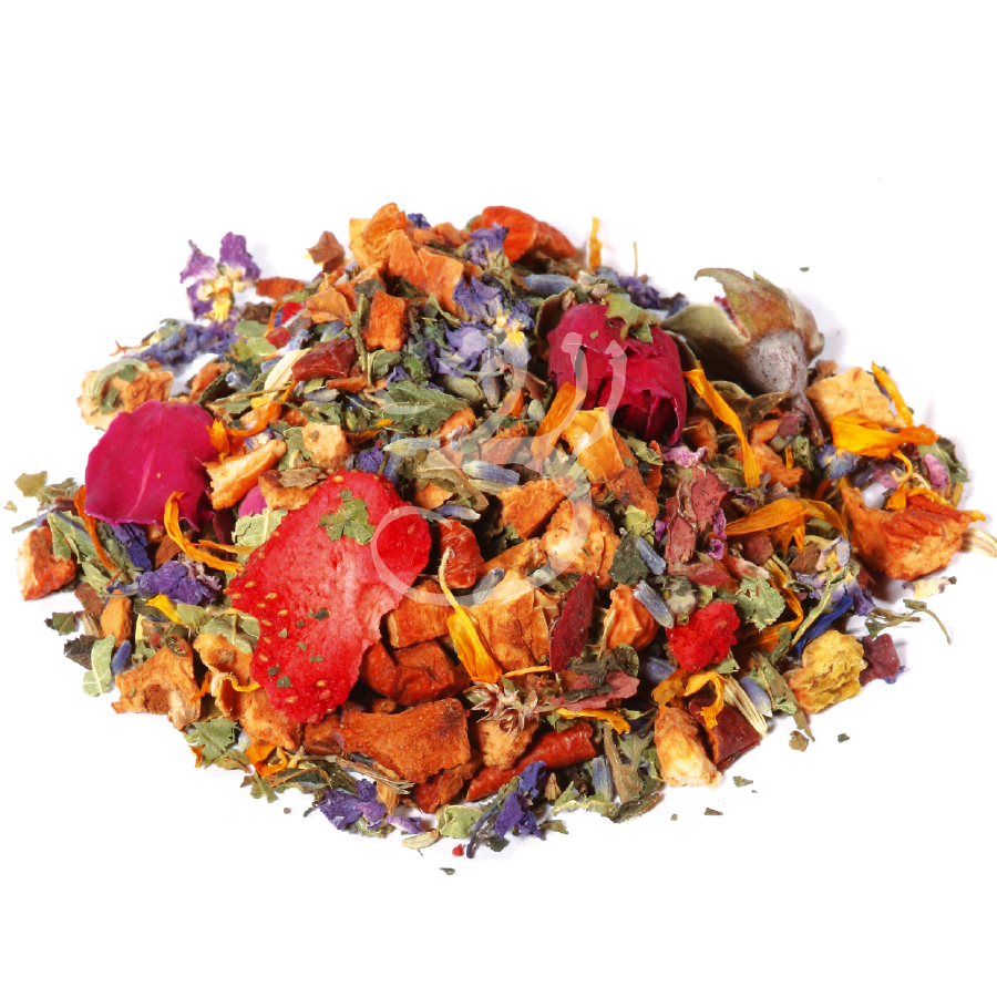 Složení: celé verbenové listy, kousky jablek, listy kopřivy, fenykl, vinné listy, přírodní aroma, květy levandule, žluté měsíčkové lístky, fialkové květy, kousky jahod, poupata růže, tymián, rozmarýn, bazalka, květy slézu.