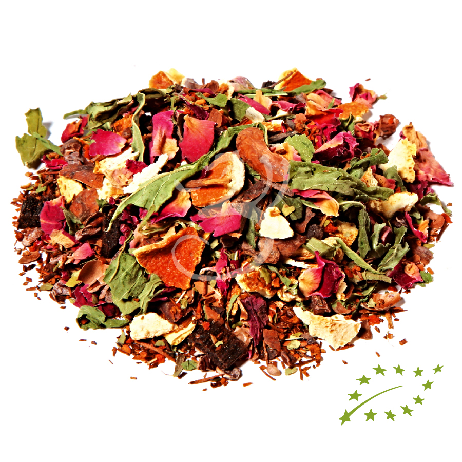 Složení: rooibos (min.30%) *, zelené maté *, pomerančová kůra *, konopné listy * kakaové slupky *, chili paprika *, okvětní lístky růže *, přírodní aroma pomeranče, kousky vanilky bourbon *, kousky jahod *. Produkty označené * pocházejí z kontrolovaného ekologického zemědělství.
