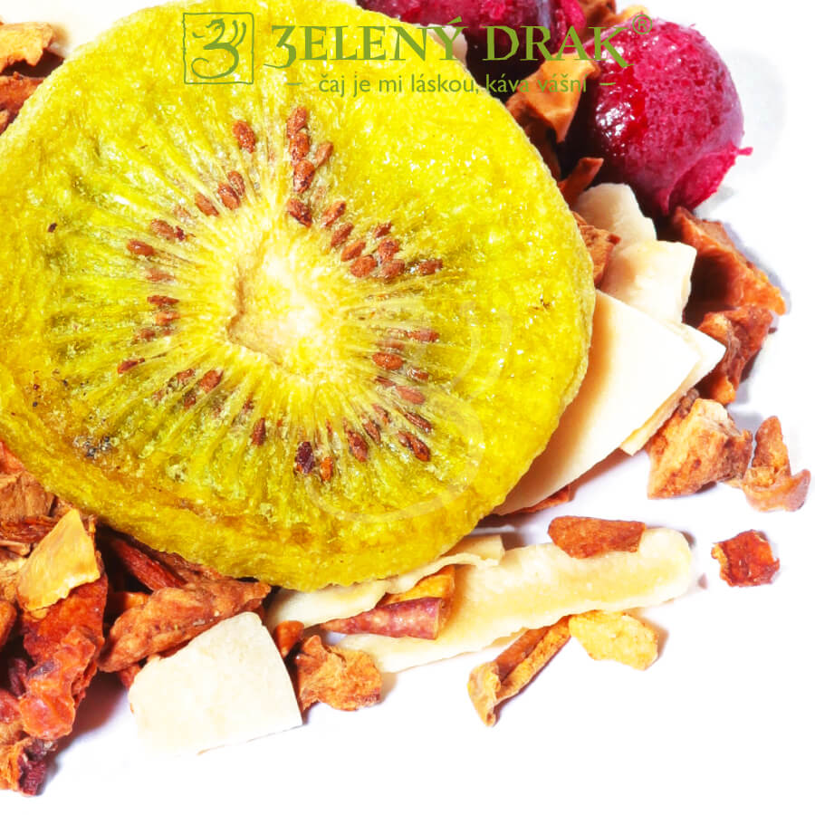 Složení čaje: jablko, kokos (kokosový ořech, kokosový olej, cukr), příchuť, plátky kiwi, višně, brusinky