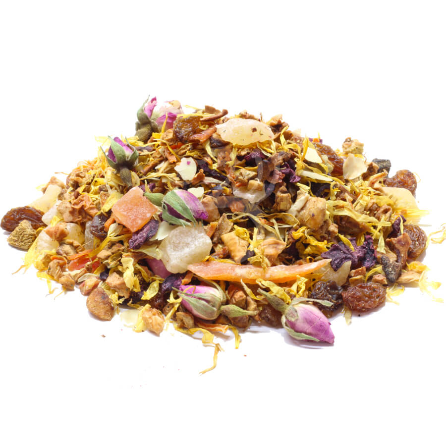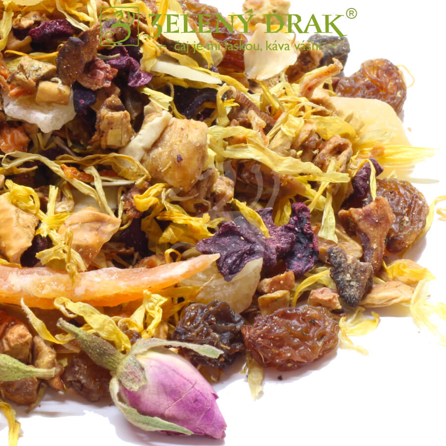 Složení čaje: jablko, hroznové víno (hrozny, rostlinný olej), ananas (ananas, cukr), papája (papája, cukr), mrkev, červená řepa, MANDLE (5%), příchuť, švestka (švestka, cukr) (3%), žluté okvětní lístky měsíčku, poupata růží.