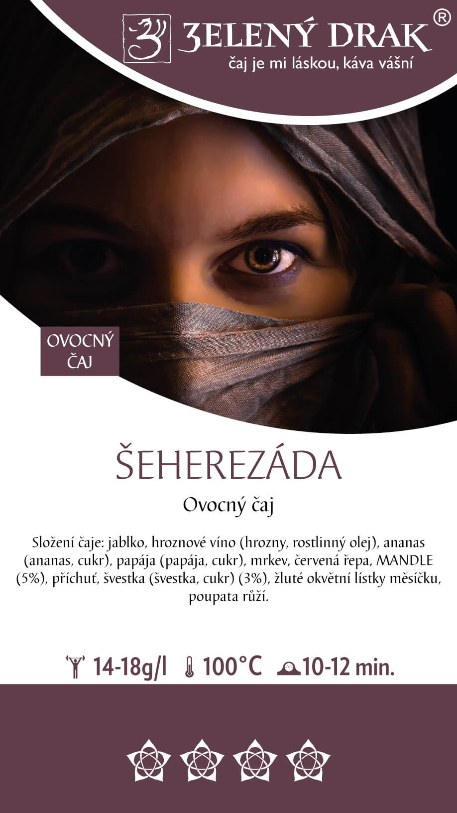 Vůně a chuť: švestka a marcipán Šeherezáda je čaj, který viniká netradičním spojením marcipánu a švestky. Kdo miluje marcipán a netradiční exotické chutě, bude nadšen. Dobrou chuť.